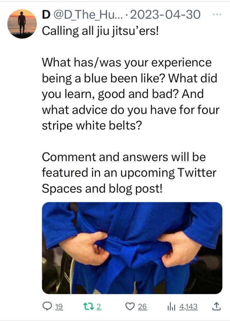 The screenshot below is of a tweet I posted recently, asking folks what their experience being a blue belt was/is like and if they have any advice for four stripe white belts. I got some great answers! Click the screenshot below to read the comments…