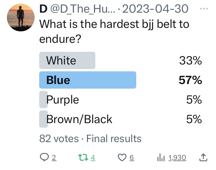 And here is a Twitter Poll I put out asking people to vote for what they thought was the hardest bjj belt to endure. And the winner is…Blue Belt!